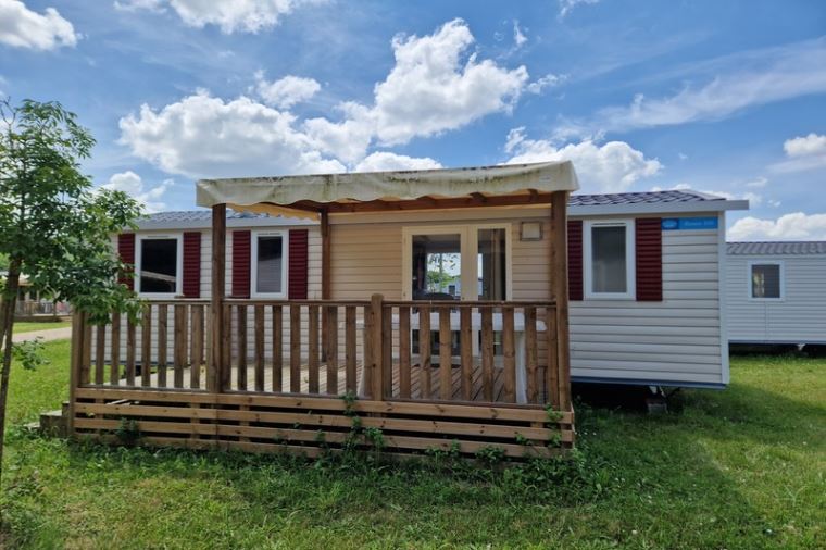 Extérieur : terrasse semi-couverte avec salon de jardin.