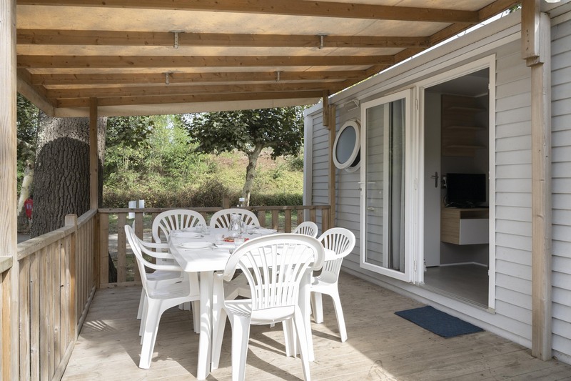 Extérieur : terrasse semi-couverte avec salon de jardin.