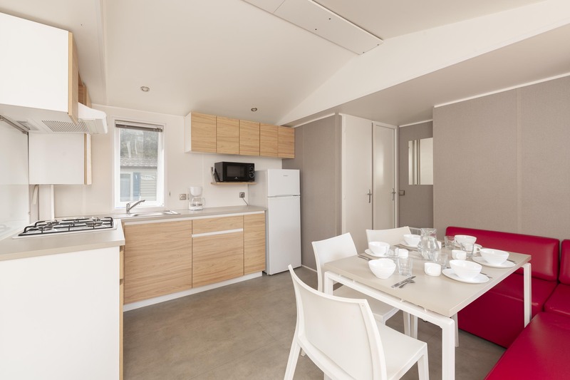 Coin salon/séjour : cuisine équipée (évier, feux gaz, réfrigérateur, micro-ondes, cafetière, vaisselle), chauffage.