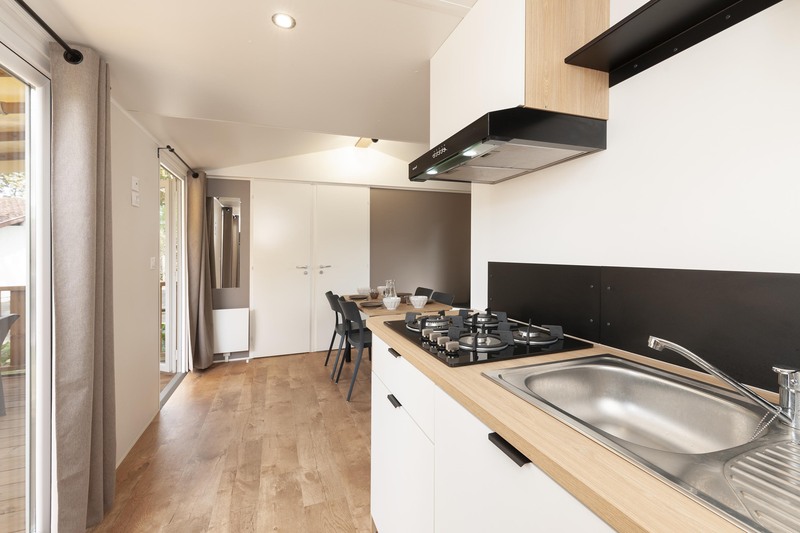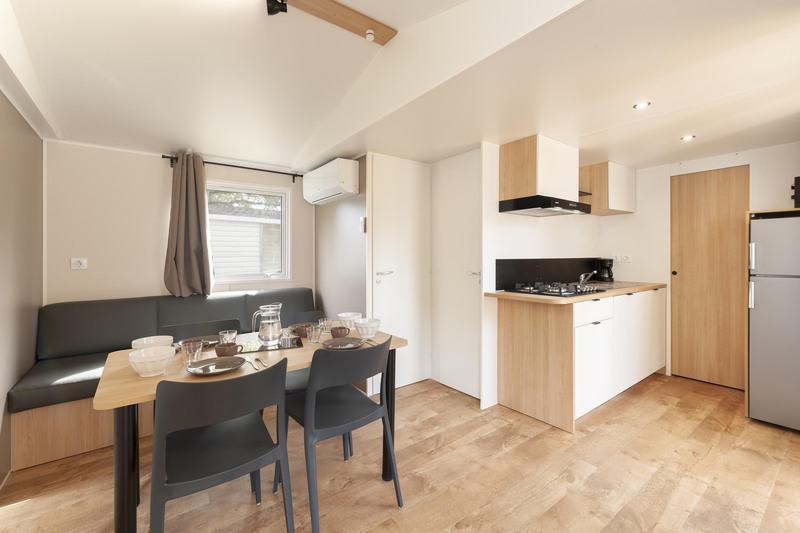 Coin salon/séjour : cuisine équipée (évier, feux gaz, réfrigérateur-congélateur, cafetière, micro-ondes, vaisselle), chauffage, climatisation.