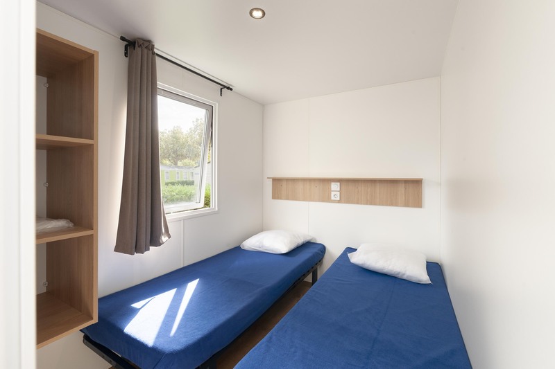 Coin nuit : une chambre avec 1 lit double, une chambre avec 2 lits simples côte à côte, oreillers et couvertures fournis.