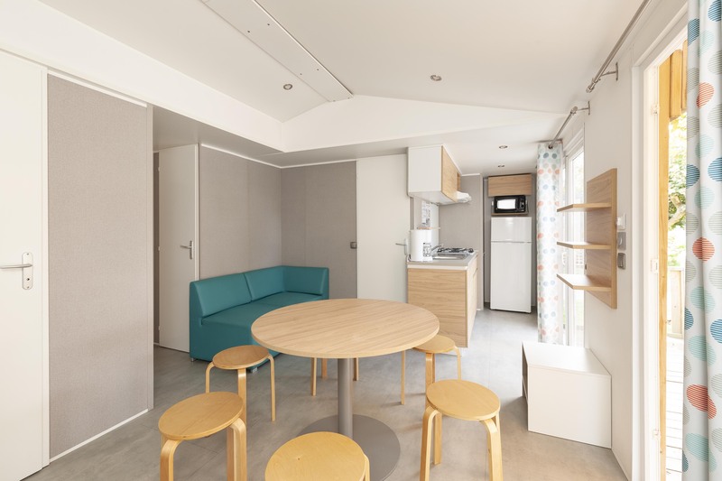Coin salon/séjour : cuisine équipée (évier, feux gaz, réfrigérateur, micro-ondes, cafetière, vaisselle), et climatisation.