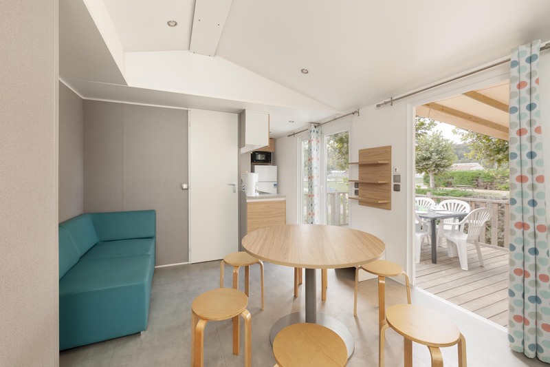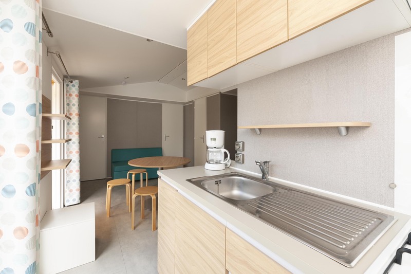 Coin salon/séjour : cuisine équipée (évier, feux gaz, réfrigérateur/congélateur, micro-ondes, cafetière à filtre, vaisselle), climatisation.