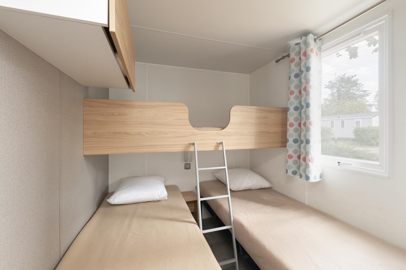 Coin nuit : une chambre avec 1 lit double (140×190), deux chambres avec 2 lits simples (70×190) côte à côte, oreillers et couvertures fournis.