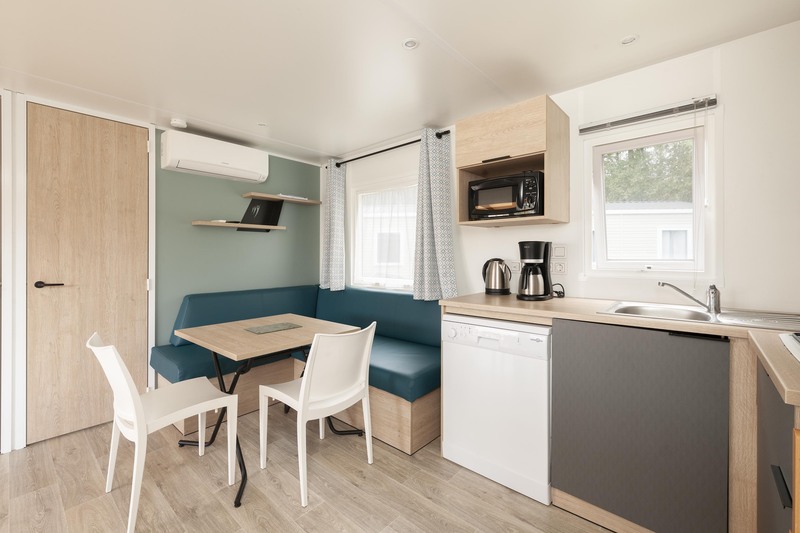 Séjour/ cuisine: 1 coin salon-séjour , cuisine équipée (évier, feux gaz, réfrigérateur, cafetière, micro-ondes, vaisselle), chauffage, climatisation.